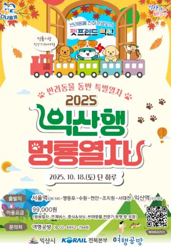 익산시 관계자는 "멍룡열차는 철도를 통해 익산의 자연과 문화를 잇는 반려동물 친화 힐링 여행으로 기획됐다"며 "앞으로도 전국 반려동물과 보호자가 찾고 싶은 도시로 발돋움할 수 있도록 다양한 프로그램을 확대해 나가겠다"고 말했다.