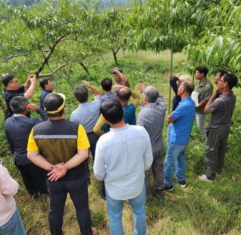 ![]() 복숭아 재배 농업인들이 복숭아 전정 기술 등 현장교육에 참여하고 있다. |