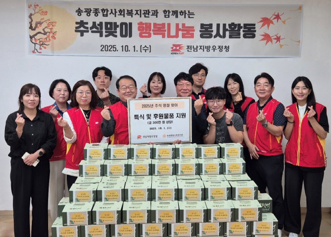이날 전남지방우정청 행복나눔봉사단은 복지관을 이용하는 160여 명의 어르신들에게 갈비, 잡채 등 명절 음식으로 구성된 특식을 제공하고, 배식 후에는 테이블과 식당 주변을 정리하며 따뜻한 명절 분위기를 전했다.
