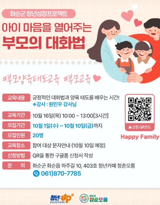 조미화 인구청년정책과장은 “부모님의 양육 태도를 객관적으로 진단하고, 자녀와의 관계를 발전시킬 방법을 함께 고민하는 맞춤형 프로그램을 통해 긍정적인 관계 형성에 큰 기대가 된다”라고 전했다.
