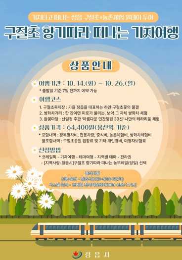 ![]() 기차 타고 떠나는 정읍 가을 정취…‘농뚜레일 투어’ 19일까지 참가자 모집 |