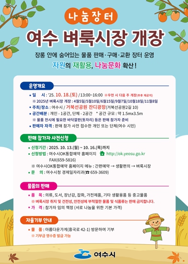 오병구 여수시 경제일자리과장은 “선선한 가을바람 속에서 가족과 친구들이 벼룩시장에서 즐거운 추억을 만들고 나눔의 가치를 함께 느끼길 바란다”며 “시민 여러분의 많은 관심과 적극적인 참여를 부탁드린다”고 말했다.