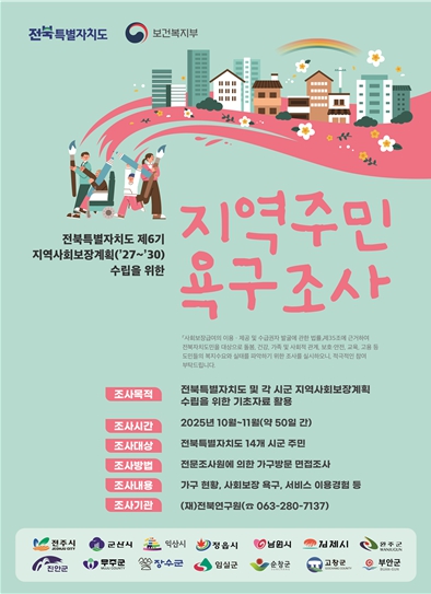 양수미 전북특별자치도 사회복지정책과장은 “이번 주민욕구조사는 도민이 필요로 하는 복지서비스를 정확히 파악하기 위한 중요한 과정”이라며 “도민이 체감할 수 있는 복지정책을 만들 수 있도록 많은 참여를 부탁드린다”고 말했다.