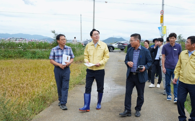 ![]() 윤병태 시장(왼쪽 두 번째)이 15일 반남면 덕산리 일대 피해 논을 방문해 현황을 점검했다. |