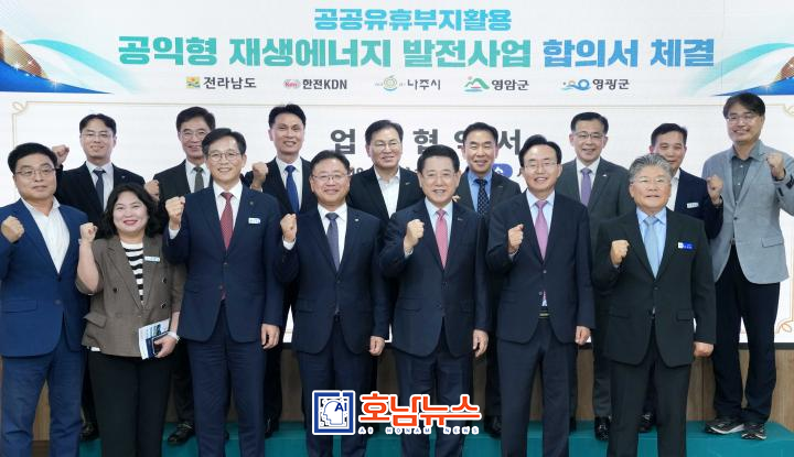 Jeollanam-do Province announced on the 15th that it signed a business agreement for the “Public-Interest Renewable Energy Project” with Naju City, Yeonggwang County, Yeongam County, and KEPCO KDN at Naju City Hall, in line with the central government’s policy for a nationwide renewable energy transition.