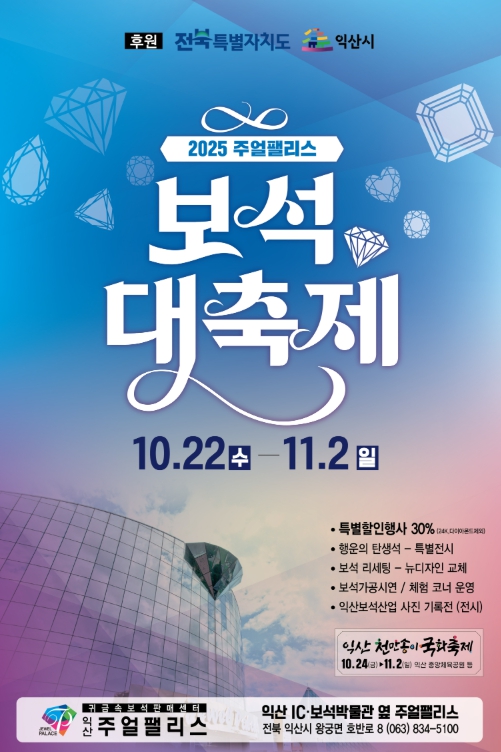 한편, 주얼팰리스 보석대축제는 매년 봄·가을 두 차례 왕궁보석테마 관광지 일원에서 열리며, 산업과 관광이 어우러진 익산의 대표 행사로 자리매김하고 있다.
