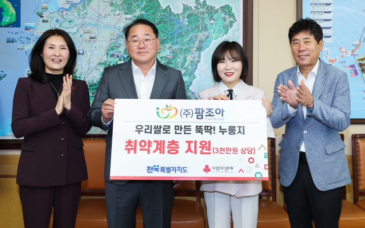 ㈜팜조아는 20일 전북특별자치도를 방문해 3천만 원 상당의 누룽지 2만 봉을 전북사회복지공동모금회에 기탁했다. 이번 성품은 도내 장애인 등 취약계층에게 전달될 예정이다.