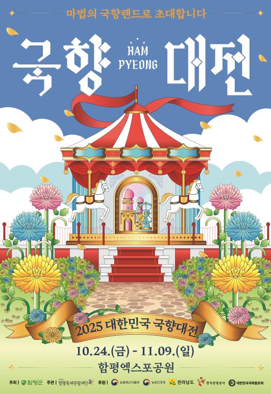 한편, 2025 대한민국 국향대전은 오는 10월 24일부터 11월 9일까지 17일간 함평엑스포공원 일원에서 ‘마법의 국향랜드’를 주제로 회전목마와 대관람차, 마법의 성 등 대형 국화조형물과 명품 국화분재 작품 전시, 브라스밴드 거리공연, 마법의 휴먼포토 등 다양하고 생동감 있는 전시·공연·체험프로그램으로 관람객을 맞이할 예정이다.