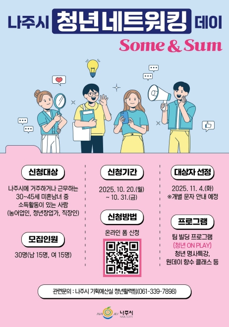 나주시(시장 윤병태)는 오는 11월 15일 나주시 일원에서 열리는 ‘청년 네트워킹 데이’ 행사를 앞두고 참가자를 모집하고 있다고 23일 밝혔다.
