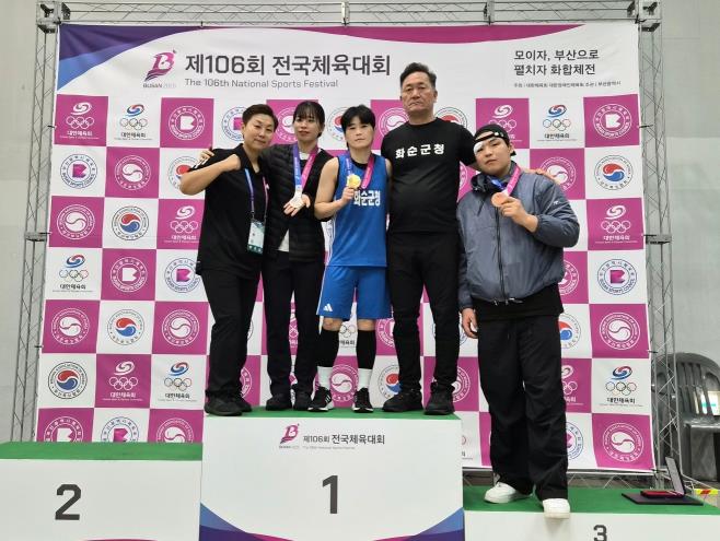 ![]() 화순군청 복싱부(왼쪽부터 박지선 코치, 임애지 선수, 박초롱 선수, 박구 감독, 주태웅 선수) |