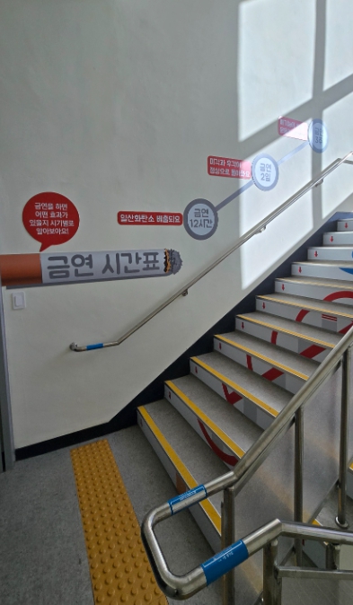 학교 주요 건물 내부 계단에 설치된 건강계단은 금연·금주를 주제로 한 문구와 이미지가 부착되어 학생들이 자연스럽게 건강 메시지를 접할 수 있도록 만들었다.