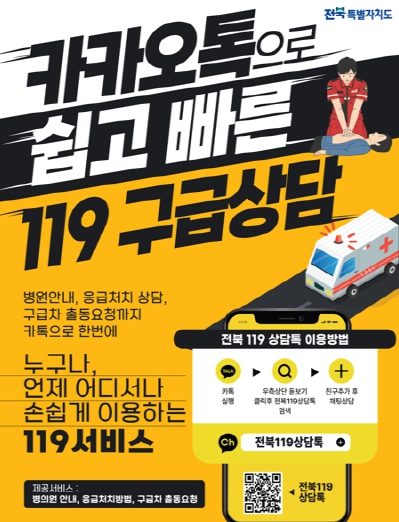 ‘전북119상담톡’은 카카오톡 채널을 통해 응급처치 지도, 병원·약국 안내, 병원선정 지원등을 제공하는 비대면 구급상담 서비스다.