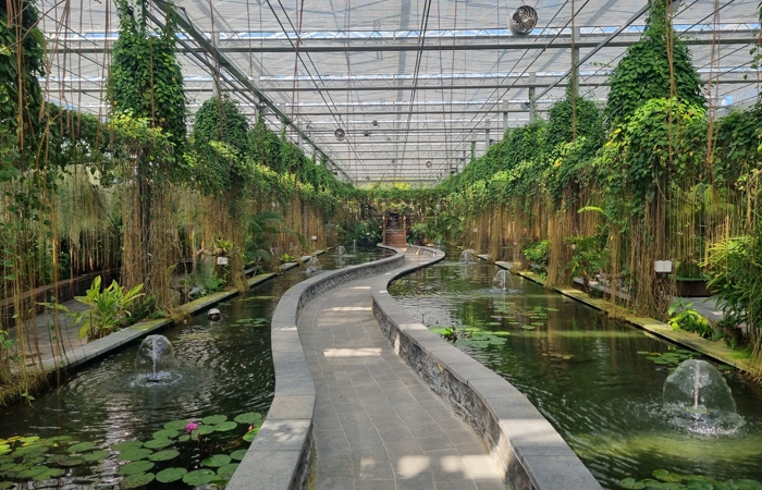 연못 위에는 수련이 곱게 피어 아름다움을 더하고, 주변에는 물칸나, 코브라아비스 등 다양한 수생식물이 조화를 이루며 다채로운 자연미를 선사한다.