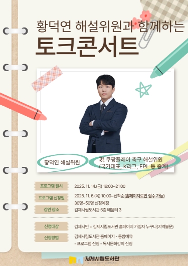 행사는 김제시민 및 도서관 홈페이지 회원이면 누구나 신청 할 수 있으며, 오는 6일 목요일 오전 10시부터 선착순 최대 50명까지 김제시립도서관 홈페이지에서 신청이 가능하다.