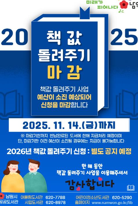 또한 남원시 공공도서관은 지난 6~7월 시민 의견을 반영하고자 ‘2025년 책값 돌려주기 사업’의 만족도 조사를 실시했다.