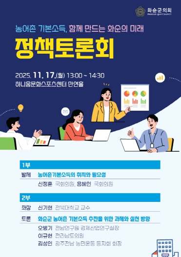 이 자리에서는 화순군 농어촌 기본소득 추진을 위한 과제와 실천 방향에 대한 심도 있는 논의가 이뤄질 예정이다.