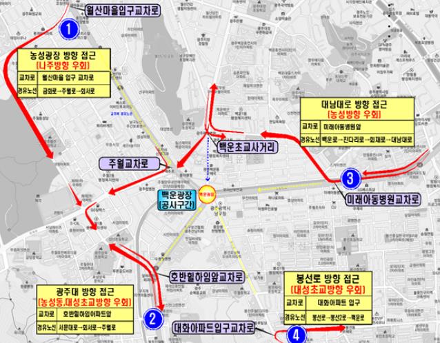 통제 구간 차량 우회도로는 ▲농성교차로에서 백운광장 방향 → 월산마을 입구 교차로에서 양궁장 방향 ▲광주대에서 백운광장 → 호반힐하임 교차로에서 양궁장 방향 ▲남광주(봉선·방림)에서 백운광장 → 미래아동병원 교차로에서 기독병원(수피아여고) 방향 ▲봉선동에서 백운광장 방향 → 대화아파트 입구 교차로에서 봉선중앙로(봉선초교) 방향 등이다.