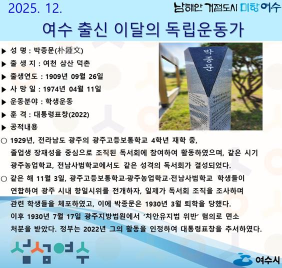 ![]() ‘2025년 12월 여수 출신 이달의 독립운동가’ |