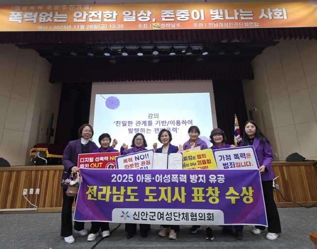 ![]() 1월 28일, 신안군여성단체협의가 2025 여성폭력추방주간 기념행사에서 ‘전남도지사 표창’을 수상했다. |