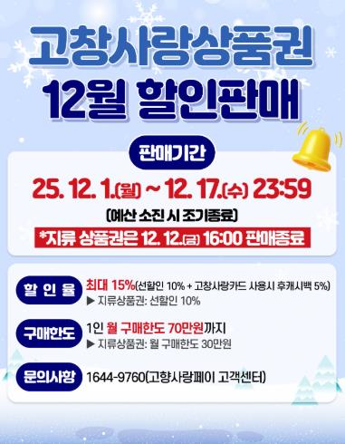 ![]() 고창군, 12월 고창사랑상품권 최대 15% 할인판매... 12월 17일까지 진행 |