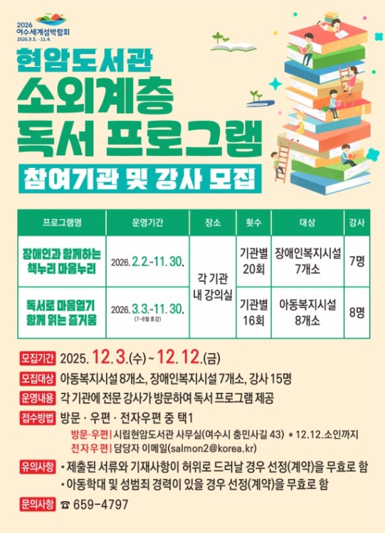 여수시 관계자는 “도서관 접근이 어려운 정보 소외계층을 위한 다양한 독서 프로그램을 제공해 문화 향유 기회를 확대하고자 한다”며 “지역 내 아동∙장애인복지시설의 많은 참여를 바란다”고 전했다.