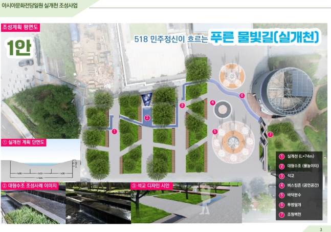 ‘아시아문화전당 실개천 조성’은 아시아문화전당 회화나무 공원 주변에 도심 물길을 조성해 아시아문화전당과 구도심 활성화를 도모하는 사업이다. 광주시는 2025년부터 2026년까지 총 30억원(국비 15억원·시비 15억원)을 투입해 사업을 추진한다.