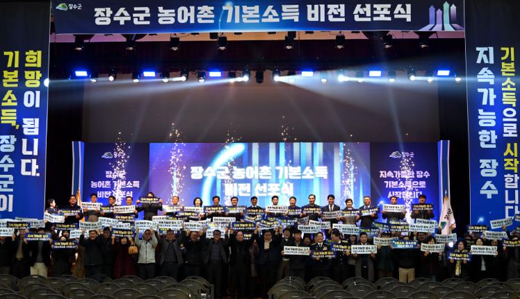 이날 행사는 장수군이 농어촌 기본소득 국가 공모사업에 추가 선정된 것을 군민과 함께 축가하고 ‘기본소득을 통해서 꿈을 가꾸는 희망의 도시 장수’라는 기본사회 실현을 위한 비전을 선포하는 의미 있는 자리로 마련됐다.