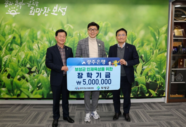 ![]() 광주은행 보성지점이 500만 원의 장학금을 (재)보성군장학재단에 기탁하며 지역사회에 따뜻한 나눔을 전했다(왼쪽부터_보성군장학재단 이사장 문찬오, 보성군수 김철우,광주은행 보성지점 지점장 정상현) |