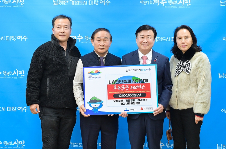 ![]() 제52회 LA한인축제에 참가한 여수지역 업체에서 지난 17일 어려운 이웃들을 위해 천만 원 상당의 후원물품을 여수시에 전달했다. |