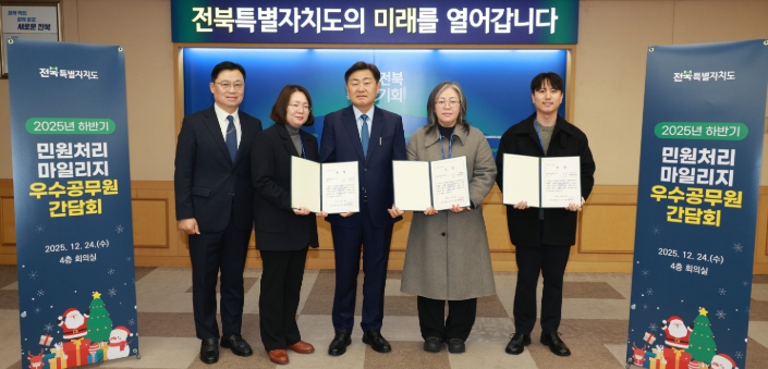 ![]() 24일 전북특별자치도청 회의실에서 열린 '2025년 하반기 민원 처리 우수직원 시상 및 간담회'에 김관영 도지사가 시상을 하고 기념촬영을 하고 있다 |