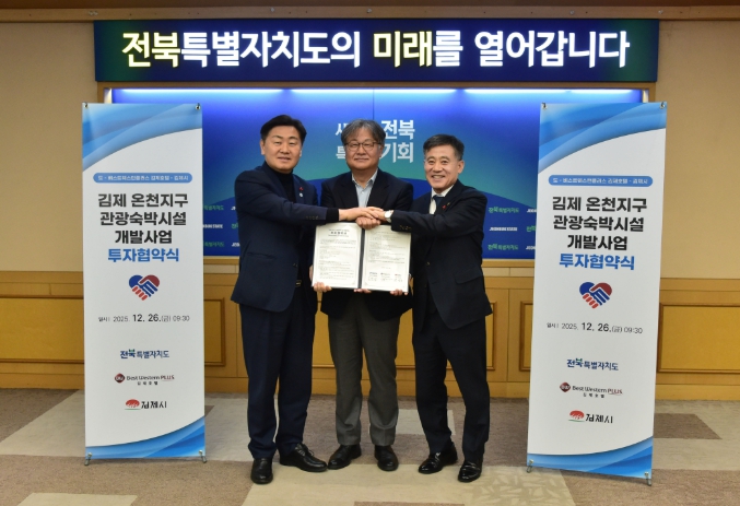 시는 26일 전북특별자치도청 도지사 회의실에서 전북특별자치도, ㈜베스트웨스턴플러스 김제호텔(대표 김해영)과 함께 김제 온천지구 관광숙박시설 개발사업을 위한 투자협약을 체결했다고 밝혔다.