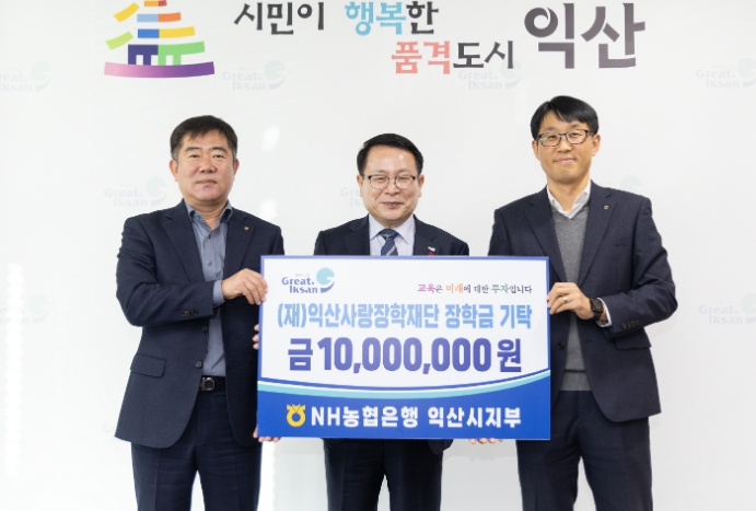 NH농협은행 익산시지부(지부장 진현욱)는 30일 (재)익산사랑장학재단(이사장 정헌율)에 장학금 1,000만 원을 기탁했다.