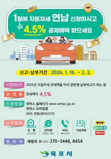 목포시 관계자는 “자동차세 연납제도는 시민의 세 부담을 줄이고 납세 편의를 높이기 위한 제도”라며 “연납 기간을 놓치지 말고 적극 활용해 주시길 바란다”고 말했다.