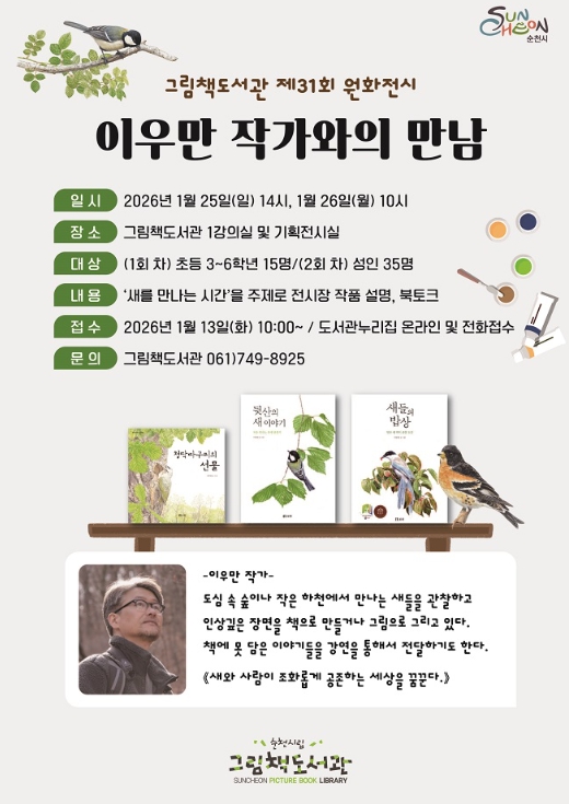 시 관계자는 “이번 작가와의 만남은 연령대와 관계없이 시민들의 생태적 감수성을 높이고, 생태수도 순천의 가치를 함께 나누는 계기가 될 것”이라며, “앞으로도 전시와 연계한 프로그램을 통해 시민들의 문화 향유 기회를 지속적으로 확대해 나가겠다”고 말했다.