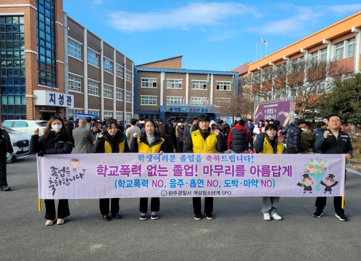행사는 졸업식 당일 학교 정문과 진입로 등 청소년 밀집지역을 중심으로 진행되며, 청소년 폭력 및 비행 예방 캠페인과 함께 완주경찰서와 합동 순찰을 병행해 현장 중심의 예방 활동을 강화했다.