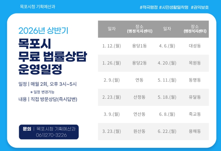 올해 첫 상담은 지난 1월 12일 용당1동 행정복지센터에서 시작됐으며, 12월 21일까지 목포시 전 동을 대상으로 순차적으로 운영될 예정이다. 다음 상담은 1월 26일 용당2동 행정복지센터에서 진행된다.