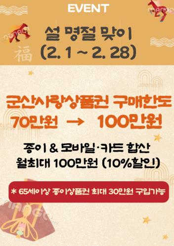 ![]() 명절 맞아 군산사랑상품권 구매 한도 100만 원 상향 |