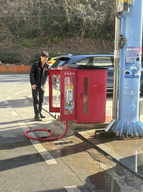 ![]() 완도 전통시장의 소방 호스 상태 확인하는 모습 |