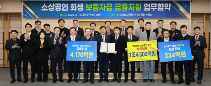 도는 10일 도청에서 김관영 도지사를 비롯해 한종관 전북신용보증재단 이사장, 11개 시군, 8개 금융기관, 소상공인연합회가 참석한 가운데 ‘2026년 소상공인 회생 보듬자금 지원사업’ 업무협약을 체결했다.