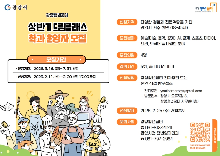 운영자(강사) 모집은 2월 11일부터 2월 20일까지로, 신청은 광양청년꿈터 누리집에서 지원서를 내려받아 이메일로 제출하거나 광양청년꿈터(광양시 오류5길 8, 중동)를 방문해 접수하면 된다.