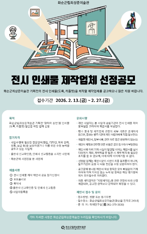 ![]() 화순군립최상준미술관, 전시 인쇄물 출판 업체 선정 공모 안내 홍보 포스터 |