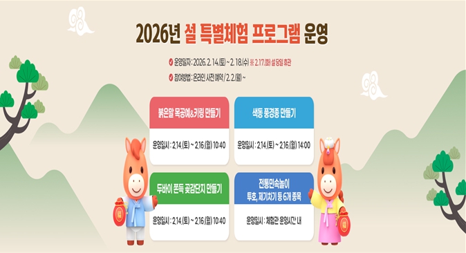 이번 특별체험 프로그램은 사전예약 접수 방식으로 진행되며 △붉은말 목공예&키링 만들기 △색동풍경종 만들기 △설 복주머니 곶감단지 만들기 등 온 가족이 함께 참여할 수 있는 체험활동으로 구성됐다.