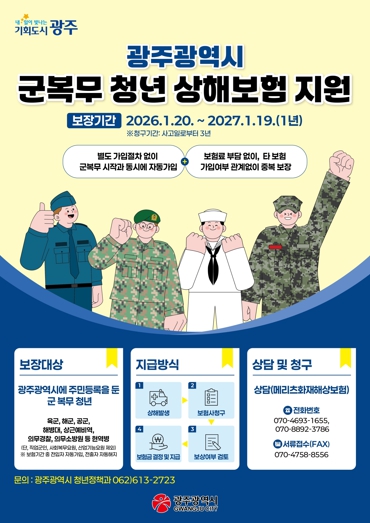 광주시는 광주전남지방병무청, 자치구, 청년 관계기관 등과 협력해 군복무 중인 광주 청년들이 보험 혜택을 받을 수 있도록 홍보물 배부, 누리집 게시 등 지속적으로 홍보할 계획이다.