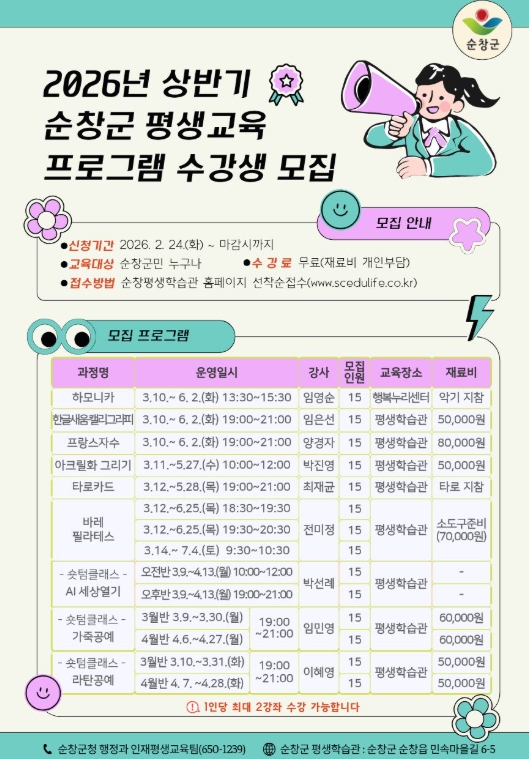 한편, 자세한 모집 요강과 접수 방법은 순창군 평생교육 홈페이지 확인할 수 있으며, 기타 문의는 순창군청 행정과로 하면 된다.