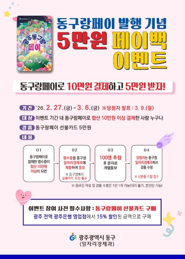 한편 동구랑페이 선불카드는 지난 23일 발행을 시작했으며, 광주 전역 광주은행 영업점에서 15% 할인된 금액으로 구매할 수 있다. 동구는 이번 페이백 이벤트가 지역경제 활성화에 긍정적인 효과를 가져올 것으로 기대하고 있다.