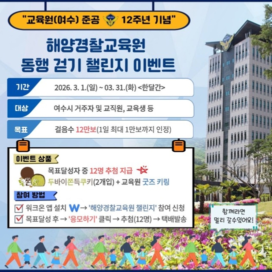여수 지역 거주자와 교육원 교직원·교육생이라면 누구나 참여 가능하며, GPS인증을 통해 여수 지역 내 걸음수가 인정된다. 참여자는 행사 기간 동안 12만보(1일 최대 1만보)를 달성하여 응모할 수 있다. 목표 달성자 중 총 12명을 선발해 기념품을 증정하며, 희망자에 한해 교육원 방문 견학 기회도 제공한다.