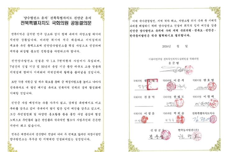 ![]() 진안군, 양수발전소 유치 위해 전북 정치 행정 한뜻(전북특별자치도 국회의원 공동결의문) |