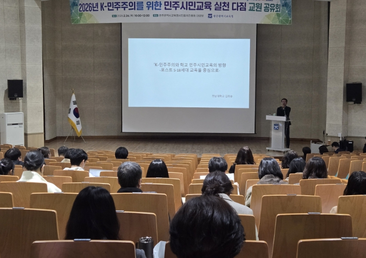 시교육청은 26일 광주시민협치진흥원 대강당에서 초·중·고·특수학교 민주시민교육 담당 교원 200여 명을 대상으로 ‘2026년 K-민주주의를 위한 민주시민교육 실천 다짐 교원 공유회’를 열고 이러한 내용을 안내했다.