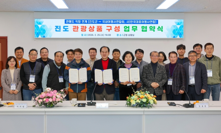 진도군은 지난 25일에 진도군청에서 국내여행사연합회, 한국대표여행사연합과 함께 ‘관매도 직항 연계 진도 관광상품 구성’을 위한 업무협약(MOU)을 체결했다.
