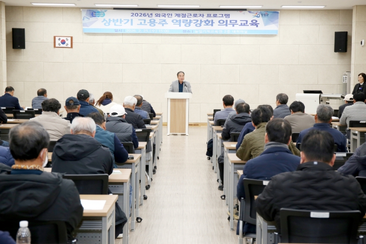 이번 교육은 2026년 상반기 고용주 121명과 각 읍면 담당자를 대상으로 진행됐으며 계절근로 프로그램 운영 지침을 안내하고 개정된 내용을 중심으로 현장에서 발생할 수 있는 문제점을 사전에 예방하기 위해 마련됐다.